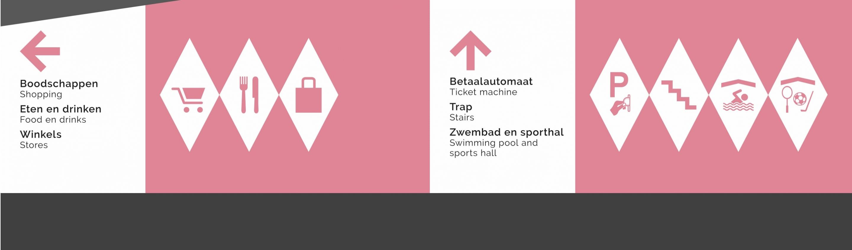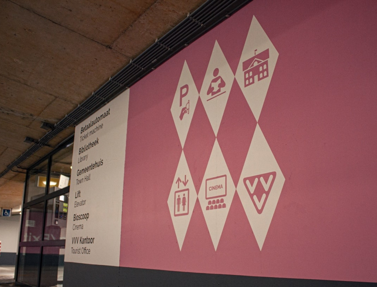 Wij ontwierpen de huisstijl voor het Citycentrum dus heeft Gemeente Veldhoven ons gevraagd de signing van de Parkeergarage in deze stijl door te voeren. Dit project hebben we begeleid van A tot Z. We zijn gestart om de huidige signing en routing op de kaart te zetten en te verbeteren. Na enige tijd sparren en goedkeuring van de ontwerpen hebben we Vormgenoten ingeschakeld voor de uitvoering van de signpaint en belettering.